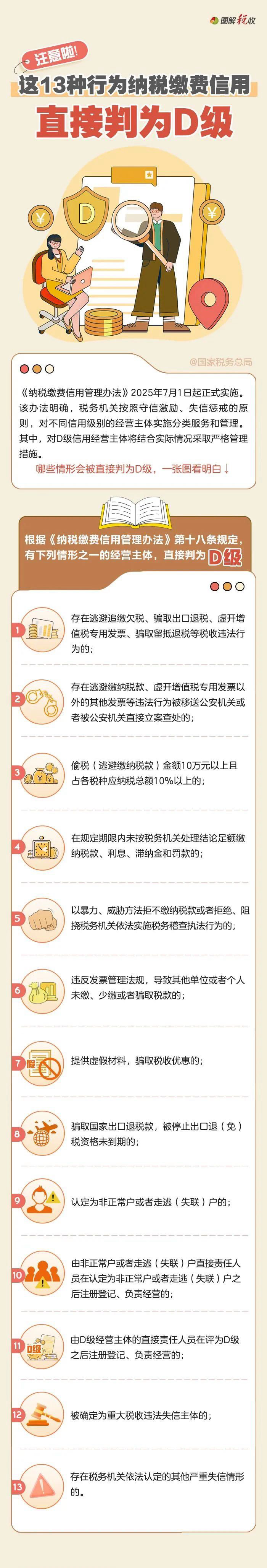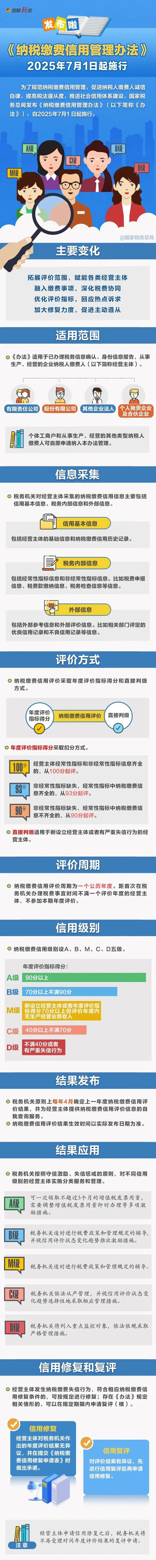 为了规范纳税缴费信用管理,促进纳税人缴费人诚信自律,提高税法遵从度,推进社会信用体系建设,国家税务总局发布《纳税缴费信用管理办法》,自2025年7月1日起施行。政策要点有哪些,一图了解↓